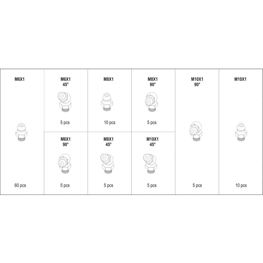 Assortiment de 110 graisseurs métriques YATO – lubrification facile et efficace pour vos machines et équipements.