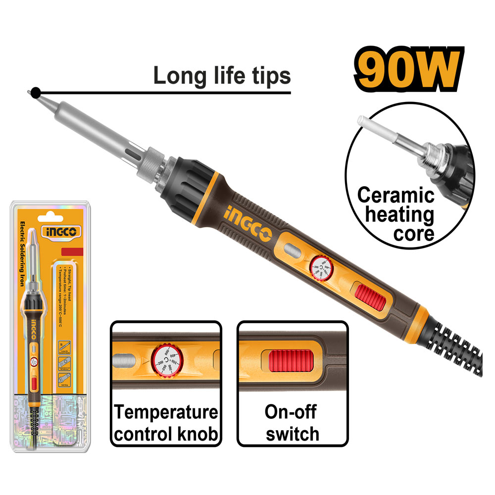 Le fer à souder 90 W est conçu pour offrir un soudage précis, rapide et fiable. Grâce à son élément chauffant en céramique, il assure une montée en température stable et homogène. Sa température réglable permet de s’adapter à différents types de travaux, tandis que sa pointe droite fine garantit une grande précision. Robuste et pratique, il est livré avec un support et conditionné en double blister.