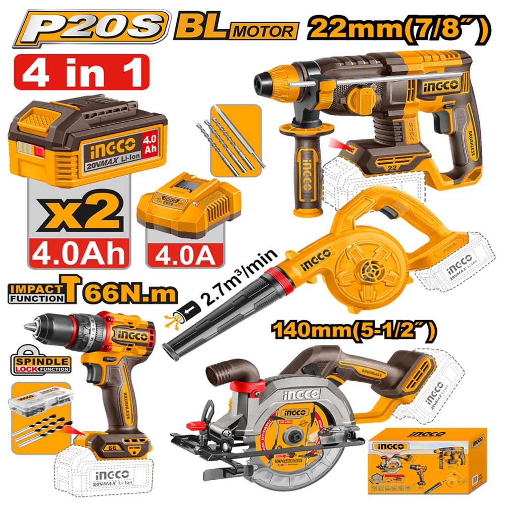 Kit combiné sans fil 20V 4 pièces INGCO