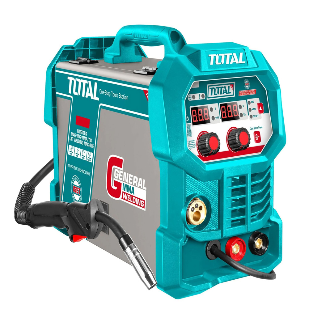 Poste à souder MIG-MAG 200 A TOTAL TMGT20058, idéal pour travaux robustes. Performance fiable, réglages précis, parfait pour acier et fer.