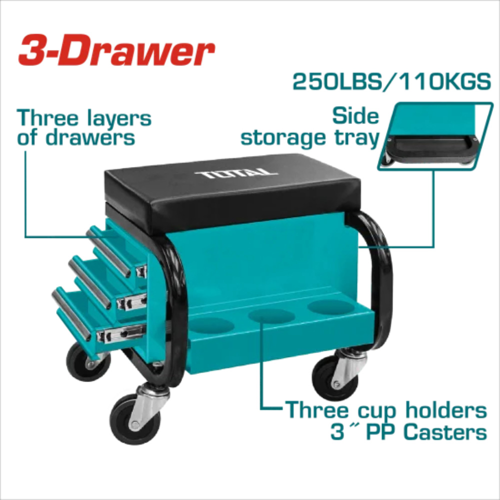 Le siège mécanicien TOTAL THCS103 est conçu pour offrir confort et mobilité lors des travaux en atelier ou sous les véhicules. Grâce à sa hauteur adaptée et à ses roulettes pivotantes, il permet de travailler plus longtemps sans fatigue, tout en gardant les outils à portée de main.